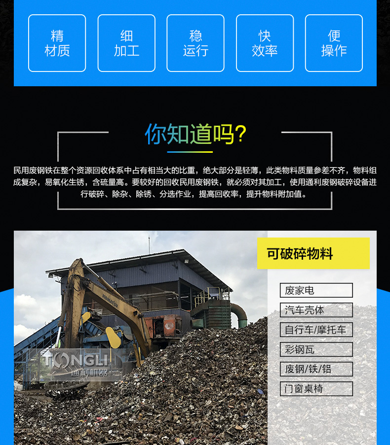 废钢破碎机是结合市场需求而成的产品。主要针对量废弃金属的再生利用,进行预破碎处理,并清理表面的油漆和污垢。该机产能每小时4T。