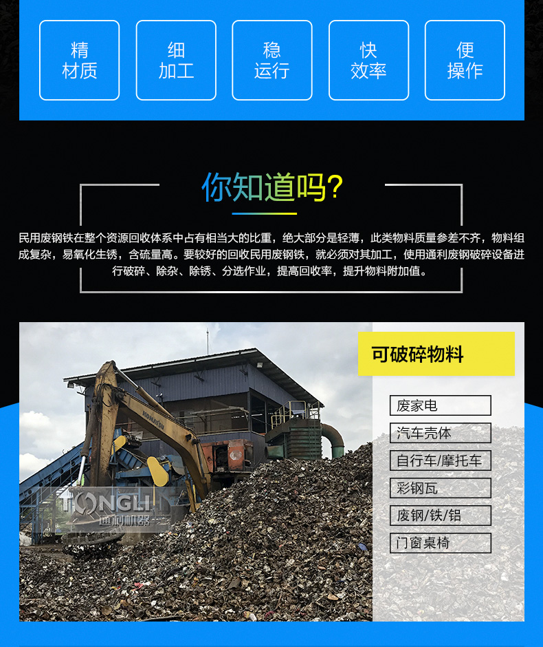 废钢破碎机是结合市场需求而成的产品。主要针对量废弃金属的再生利用,进行预破碎处理,并清理表面的油漆和污垢,该机产能每小时6-8T左右。
